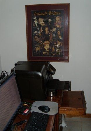 I have a desk and bookcase in front of the utility room and beside the kitchen. Even though it can get noisy with the washer and dryer running and busy with folks coming to the refrigerator, I’m thankful to have a spot set aside for my writing. Years ago, when I wrote mainly freelance articles, my neighbor took a trip to Ireland and brought me back a picture of Ireland’s authors. It’s hung beside my desk ever since.